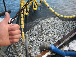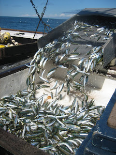 Aug 20th: Day two fishing, we made our first sets yesterday, four to be exact. The first was awesome. Ross our greenhorn skiffman, and me, have never made a seine set in our lifes, and here we are, spotter plane circling a big old school of sardines, in radio contact with Captain. Greg hollers down from the flybridge "cut 'r loose!!" Johna, the six year vet of the fishery, yanks the "bear trap" and sets Ross free in the skiff. Ross executes his turn, points directly off the stern and guns it. The net whips off the back deck, the corks making a popping noise as they peel over the stern. A minute latter and Greg is making every effort to get Ross's attention, who seems to be heading in the same direction as us, making a long narrow set...not desirable. Gregs incohrent screams fill the air, his blasting on the horn, Ross can't hear any of it over the roar of the "Elk Tuna." Thats our skiff, the Elk Tuna, powered by some old school bus motor, and she roars. It looks like someone once named it the elk, and then later was tagged with tuna, so thoes two words are faintly painted on the rear of the skiff in two different styles, but there's something catchy about the name "elk tuna", or just Tuna for short and so it is . Well we close up set numero uno, Ross circles around in the skiff, hands off the other end of the net, and we're all hooked up. My job is to stack the corks as they come down from the block onto deck, if there's a since to it i've yet to discover it. I just scramble around on a pile of cork, laying it out in broken figure eights. A perk to the corks is that they stack on the opposite side of the boat from where the net is being hauled, so the waterfall of loose sardines, jellies, dogfish and the likes fall over on Jonah, who stacks the lead line. When most of the net is back on board, I see some sardines frantically leaping at one of the corners of the net. There's some fish in there after all. As we pull more net on board, pockets